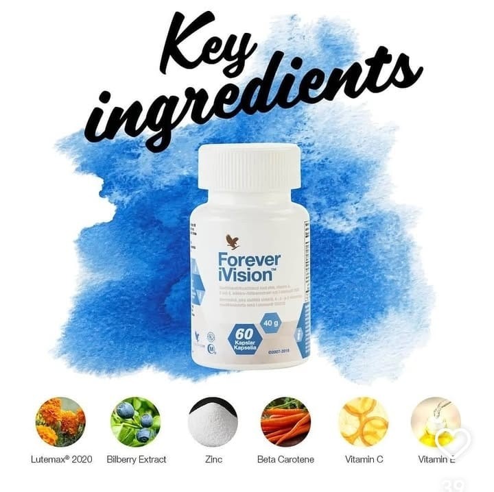 Forever iVision contiene dos excelentes carotenoides antioxidantes como lo son LUTEÍNA2020 (Lutemax® 2020) + zeaxantina y reforzados por el extracto de arándanos, Zinc, Omega-3, vitaminas A, C y E.